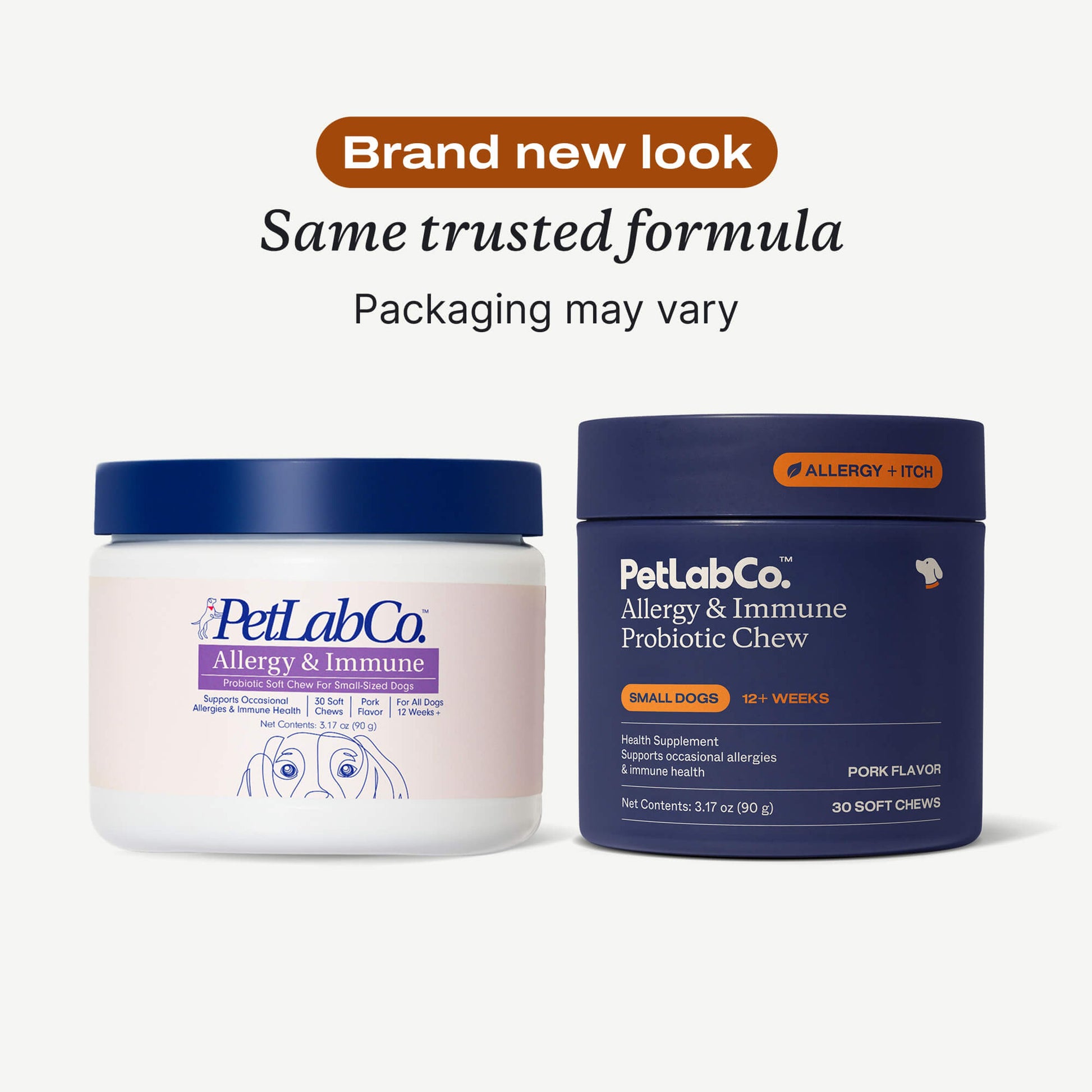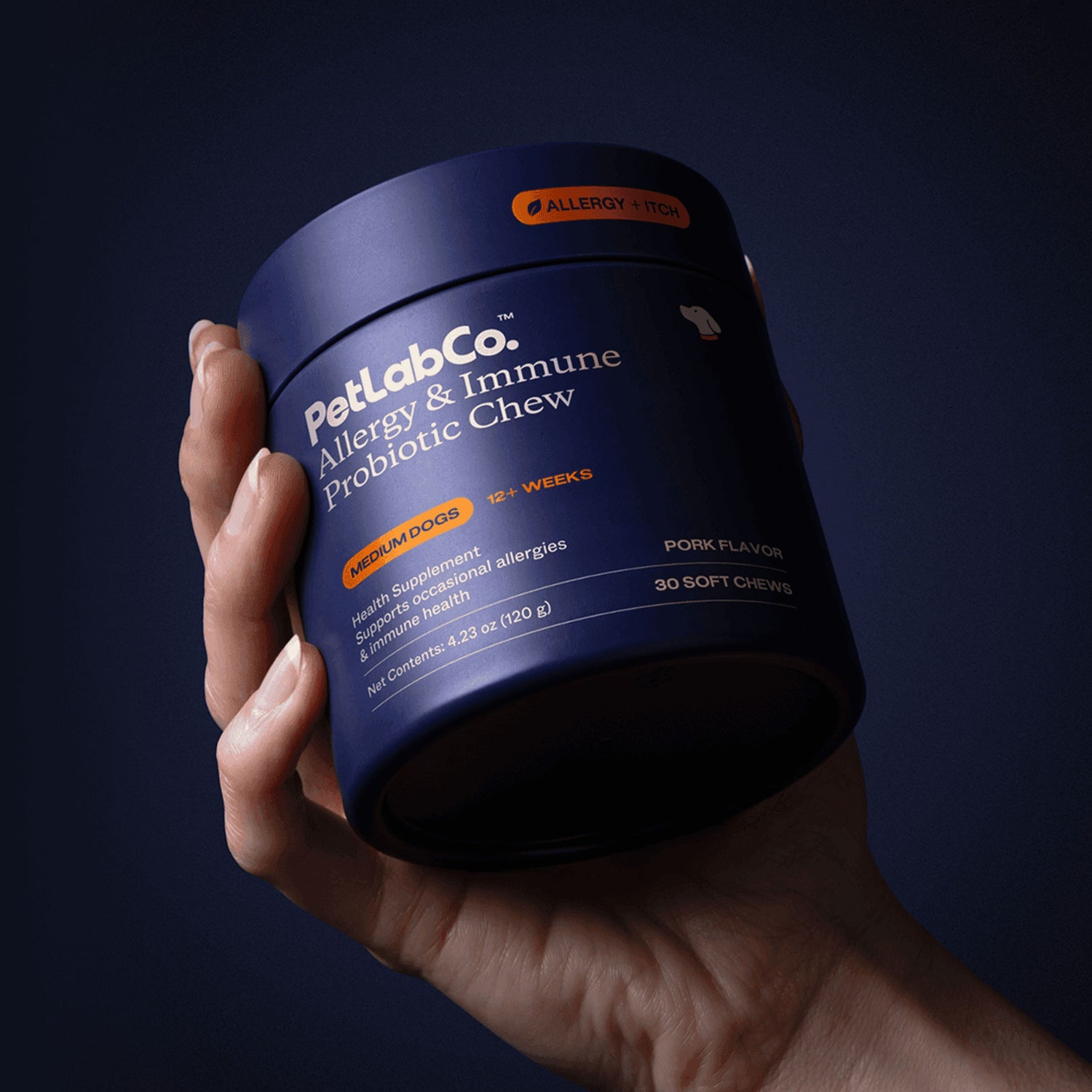 Our research-backed seasonal dog allergy supplement offers a triple-action probiotic formula that supports a dog’s immune system and their digestive health. Plus, other powerhouse ingredients like colostrum, borage oil, krill oil, and vitamin E all work synergistically to support your dog’s skin and coat. PetLab Co. Allergy & Immune is tailored to small, medium, and large dogs, so you can select the size and quantity based on their weight.