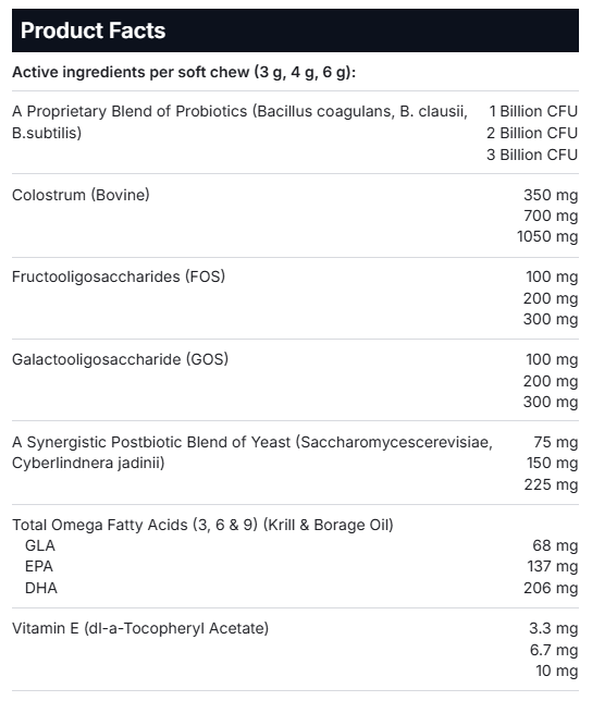 Our Probiotic Chews are also a breakthrough - they're the world's first clinically studied probioticsoft chews for dogs, shown to enhance beneficial gut bacteria and a healthy inflammatoryresponse in the gut.